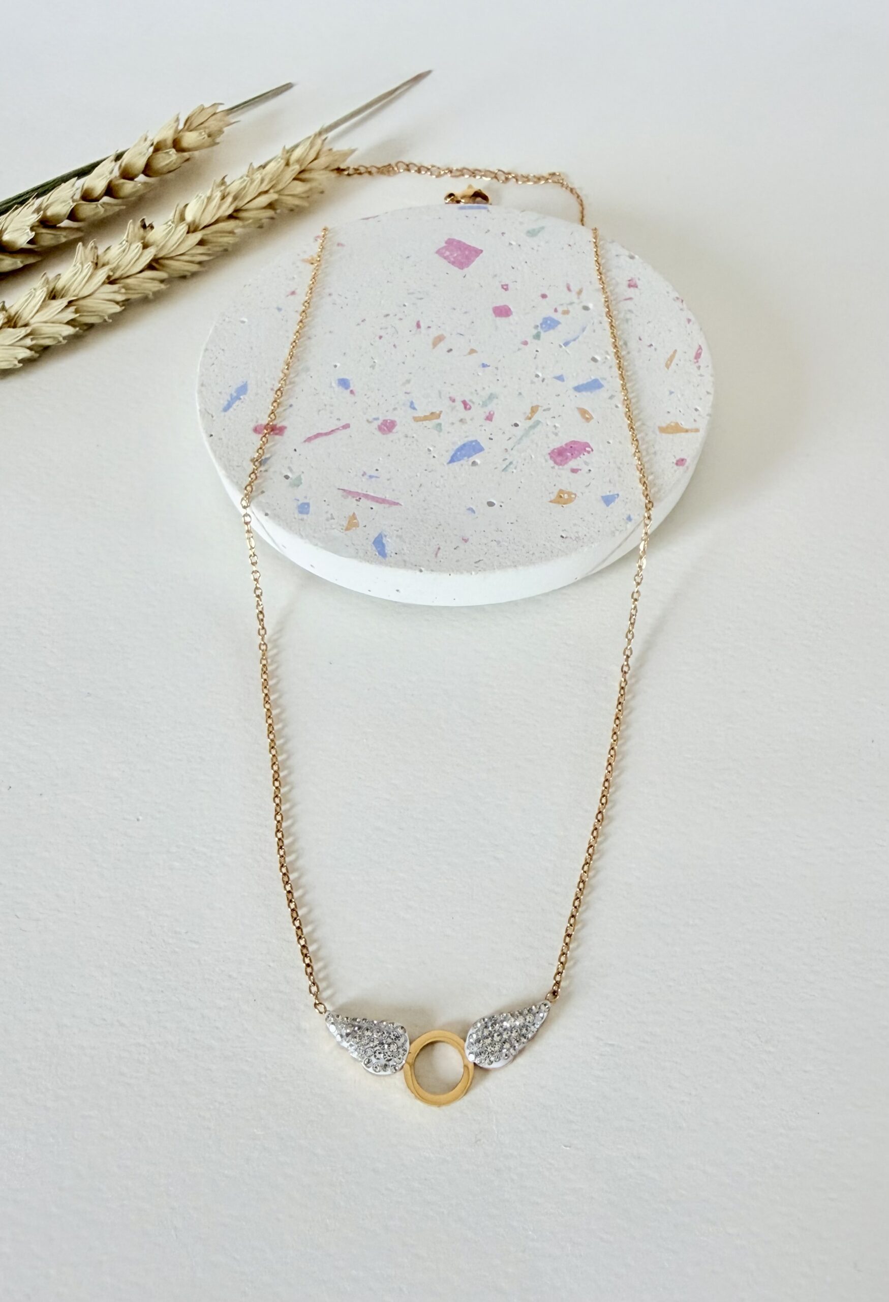 Σχεδιασμός: Κομψή χρυσή αλυσίδα με κεντρικό μοτίβο δύο φτερά σε silver-tone finish, που ενώνονται σε έναν χρυσό κρίκο.