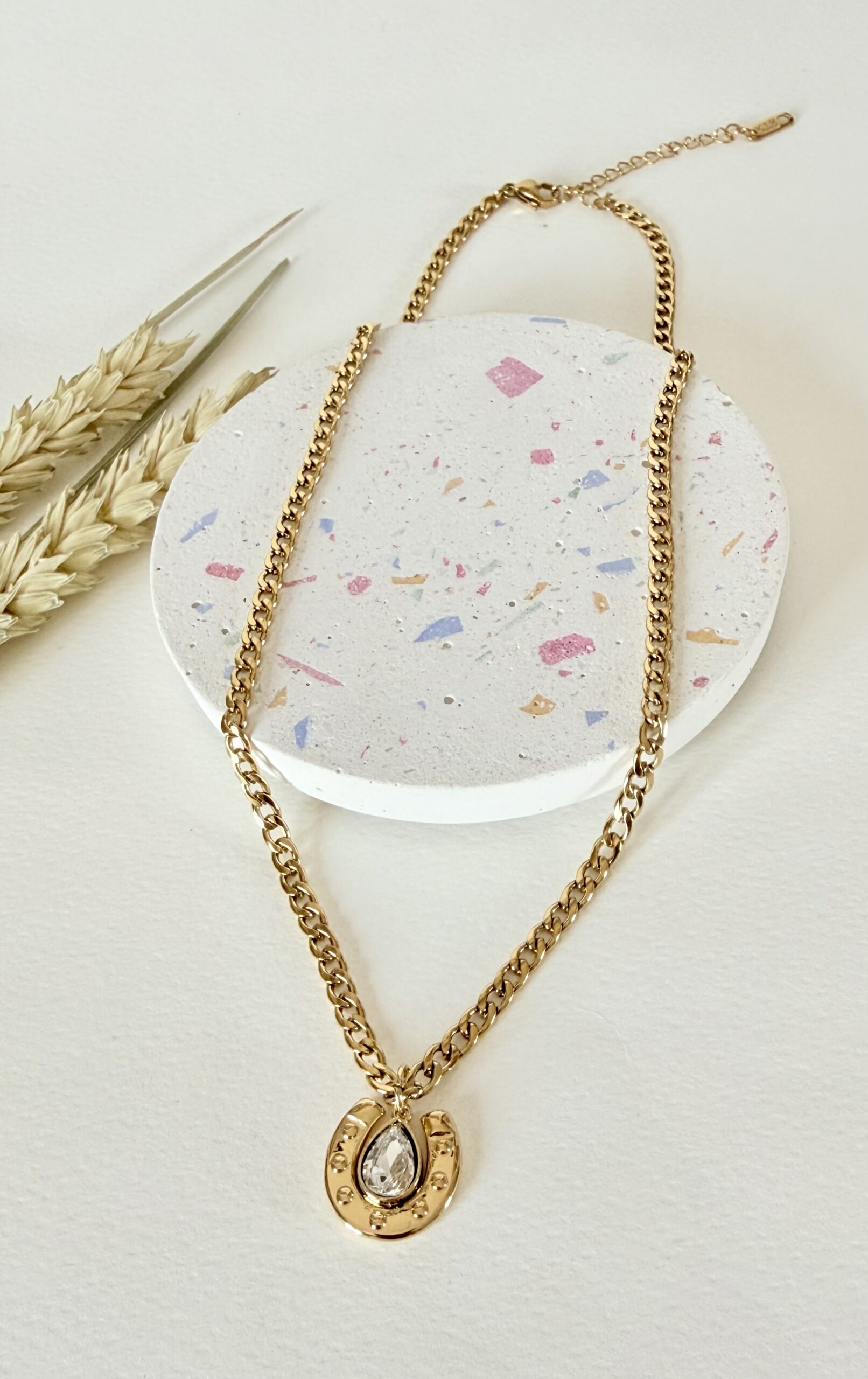 Το Horseshoe Glow είναι το κόσμημα που θα λατρέψετε! Δεν είναι απλώς ένα πέταλο, είναι μια έκρηξη χρυσής ενέργειας. Με την bold αλυσίδα του και τον κρύσταλλο που καθρεφτίζει κάθε ακτίνα φωτός, είναι το κομμάτι που φέρνει την τύχη και τη μόδα σε απόλυτη ισορροπία.