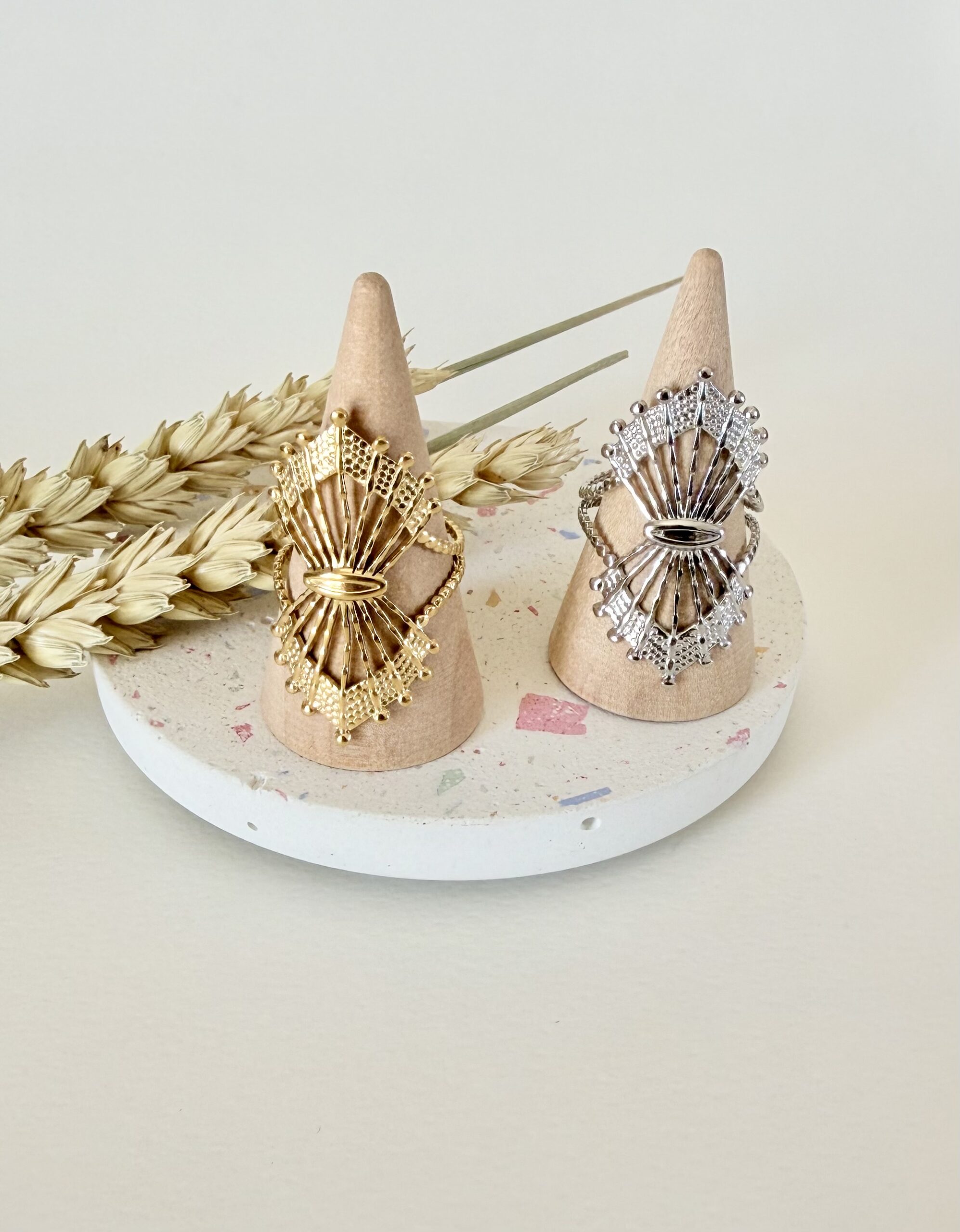 Το δαχτυλίδι “Aphrodite Ring” είναι ένα μεγαλοπρεπές statement piece, σχεδιασμένο για να εντυπωσιάζει. Το σχήμα του είναι εμπνευσμένο από μια περίτεχνη βεντάλια ή ένα στέμμα, με ακτινωτή διακόσμηση που είναι λεπτά χαραγμένηγια να δημιουργεί ένα λαμπερό, ριγέ εφέ. Η περίτεχνη, ρετρό αισθητική του και η έντονη λάμψη του μετάλλου το καθιστούν ένα διαχρονικό κομμάτι που αποπνέει έντονη θηλυκότητα και πολυτέλεια.