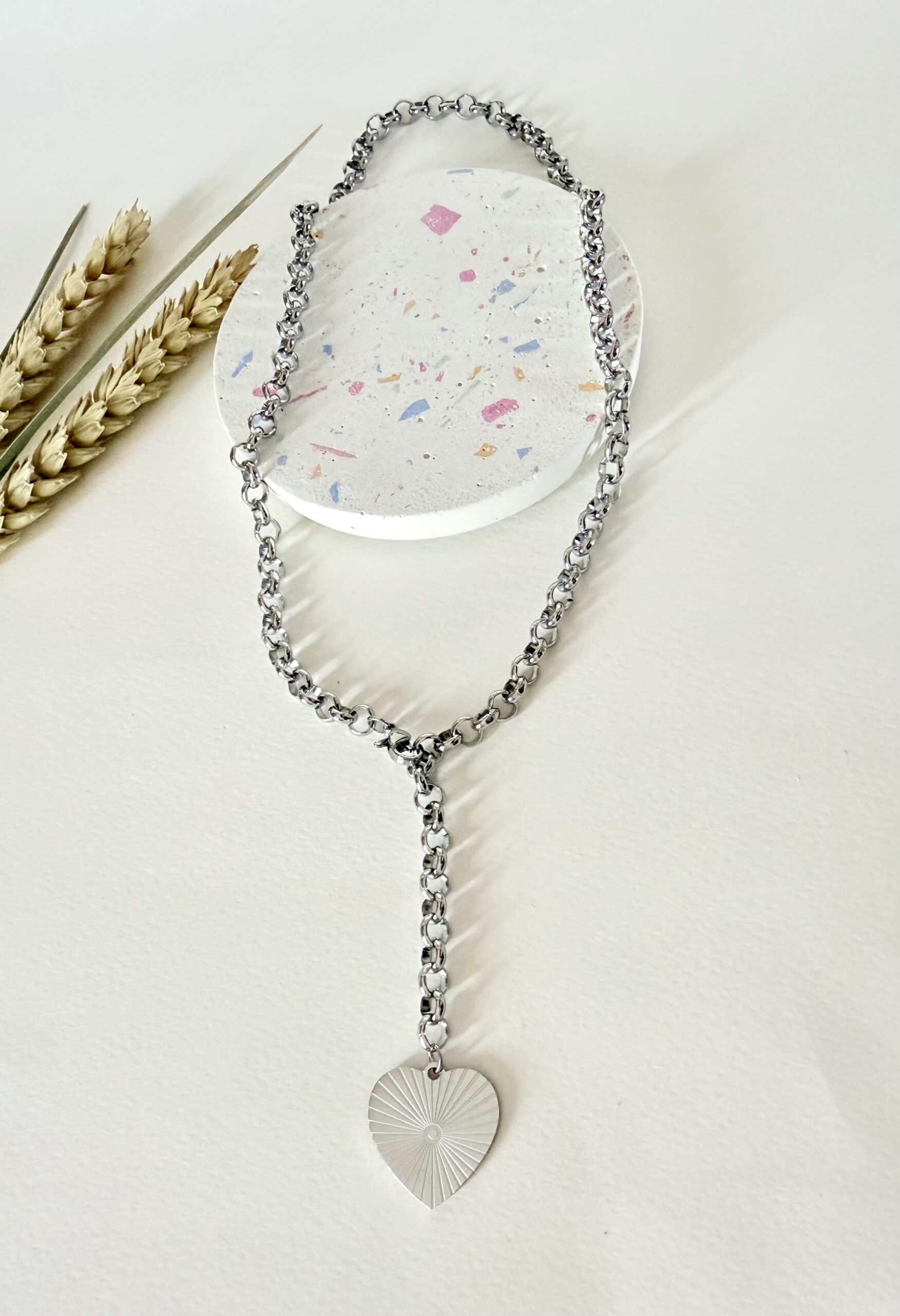 Σχεδιασμός: Κολιέ με chunky αλυσίδα και κεντρικό μενταγιόν σε σχήμα καρδιάς με ανάγλυφες ακτίνες.