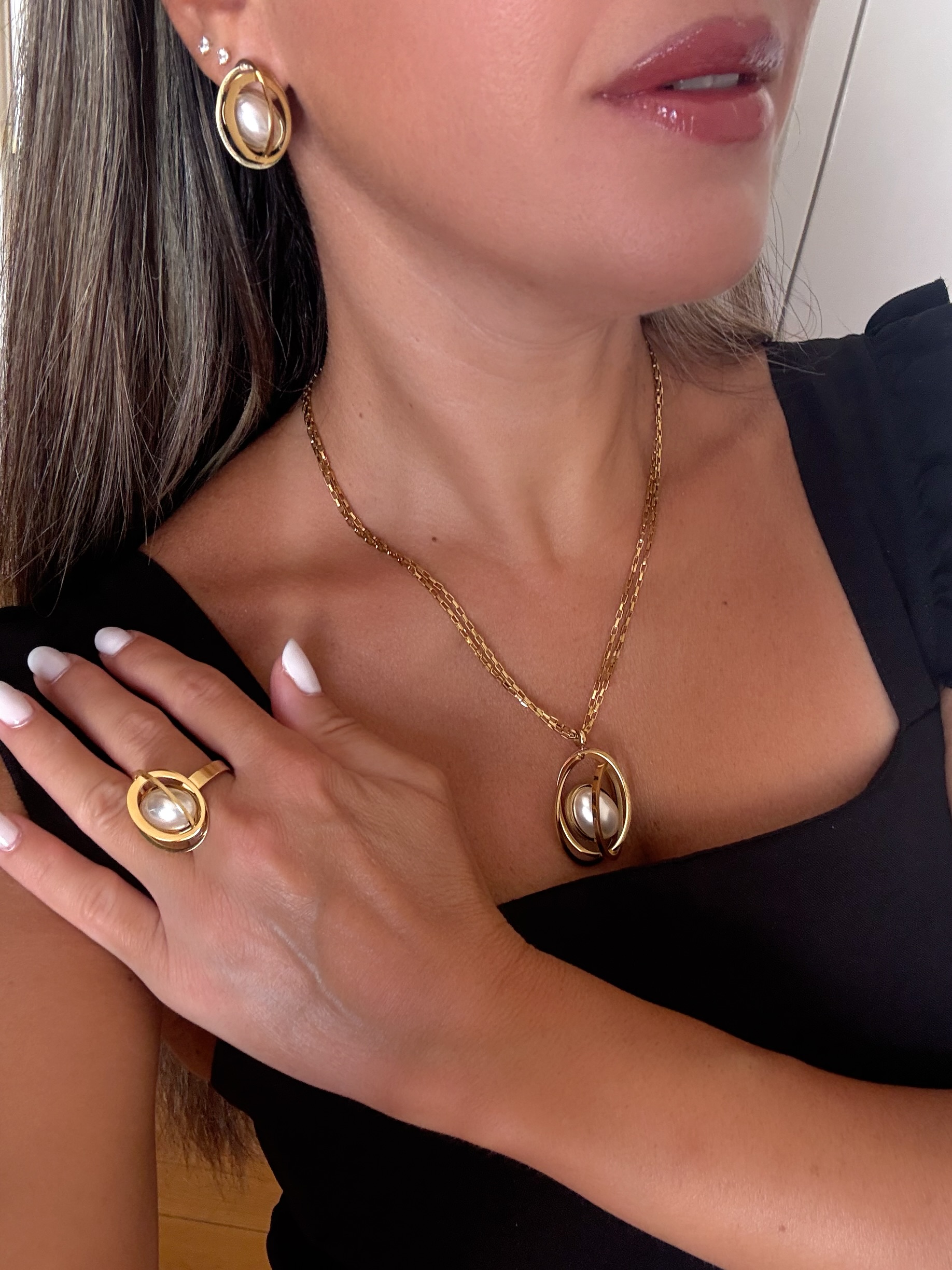 Κεντρικό Στοιχείο: Μια μεγάλη, λαμπερή πέρλα σε σχήμα δακρύου που βρίσκεται προστατευμένη στο κέντρο των τροχιών.