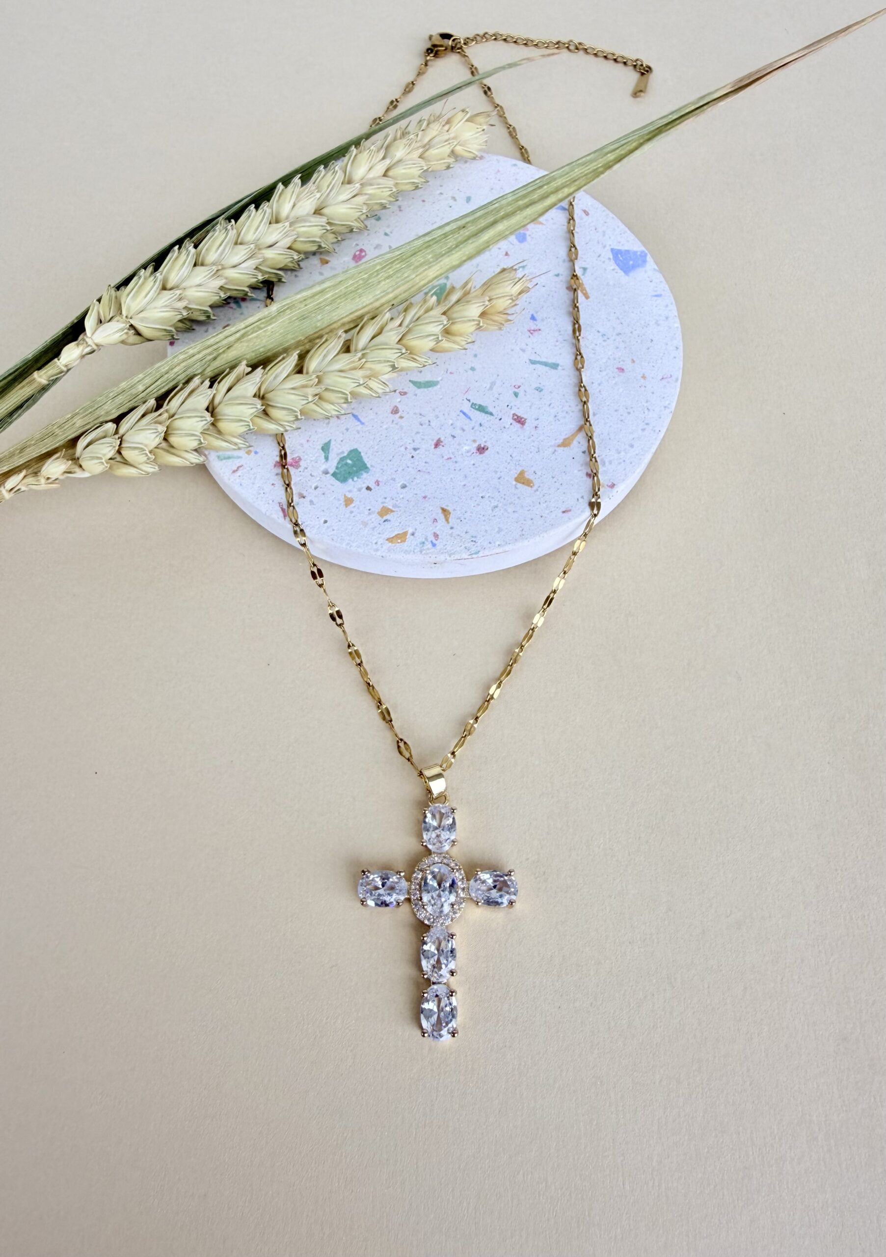 - Κρυστάλλινη Σύνθεση: Ο σταυρός αποτελείται από πέντε (5) μεγάλους οβάλ κρυστάλλους και έναν κεντρικό στρογγυλό κρύσταλλο. Οι λίθοι είναι μεγάλοι και τοποθετημένοι έτσι ώστε να μεγιστοποιούν την αντανάκλαση του φωτός.