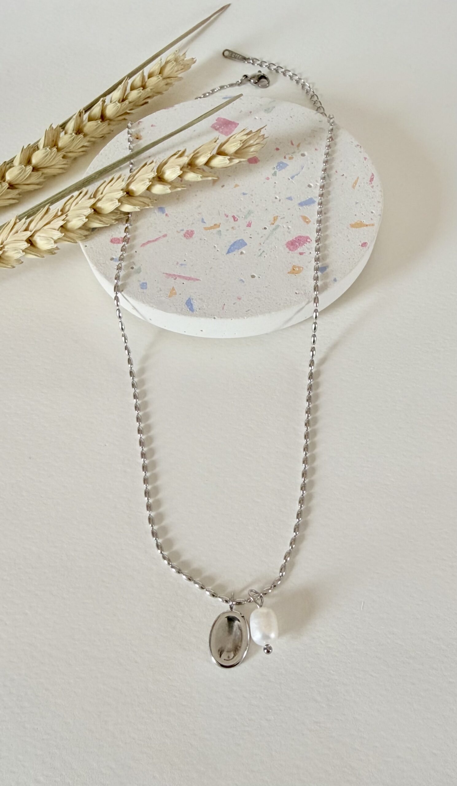 Σχεδιασμός: Ασημί αλυσίδα με διπλό μενταγιόν που αποτελείται από ένα φυσικό λευκό μαργαριτάρι και ένα minimal οβάλ πλακίδιο.