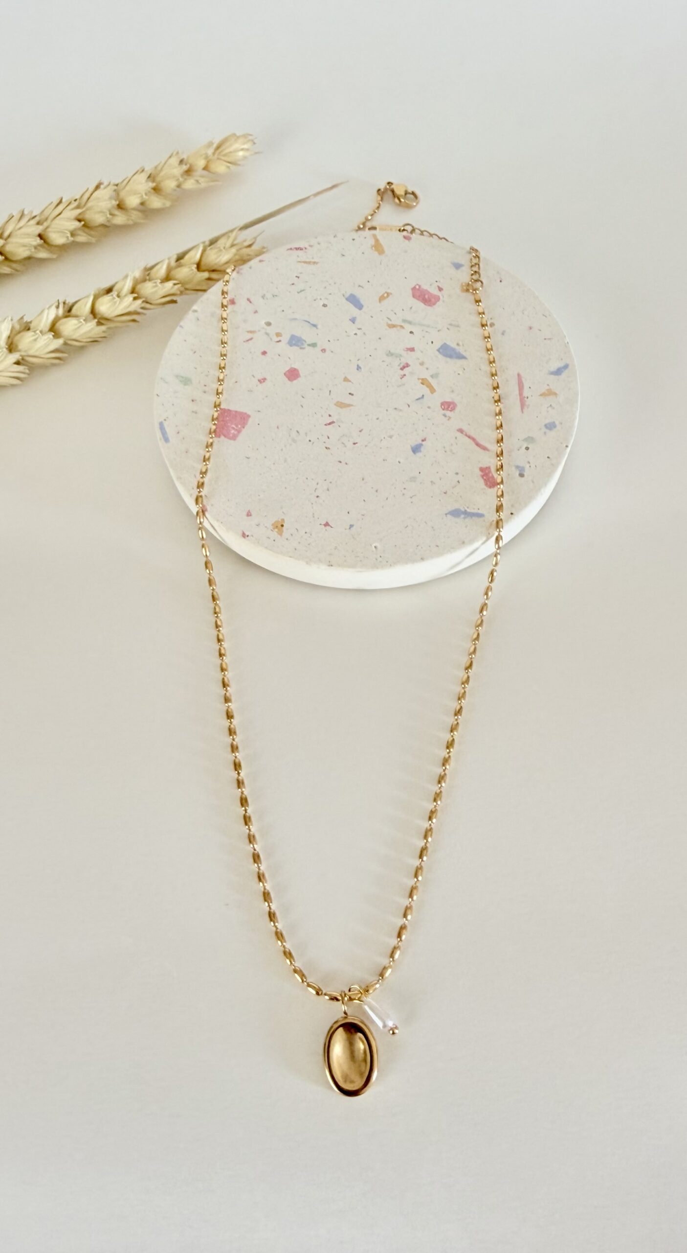 Σχεδιασμός: Χρυσή αλυσίδα με δύο κρεμαστά στοιχεία: ένα φυσικό λευκό μαργαριτάρι και ένα οβάλ πλακίδιο-καθρέφτη με high-shine φινίρισμα.