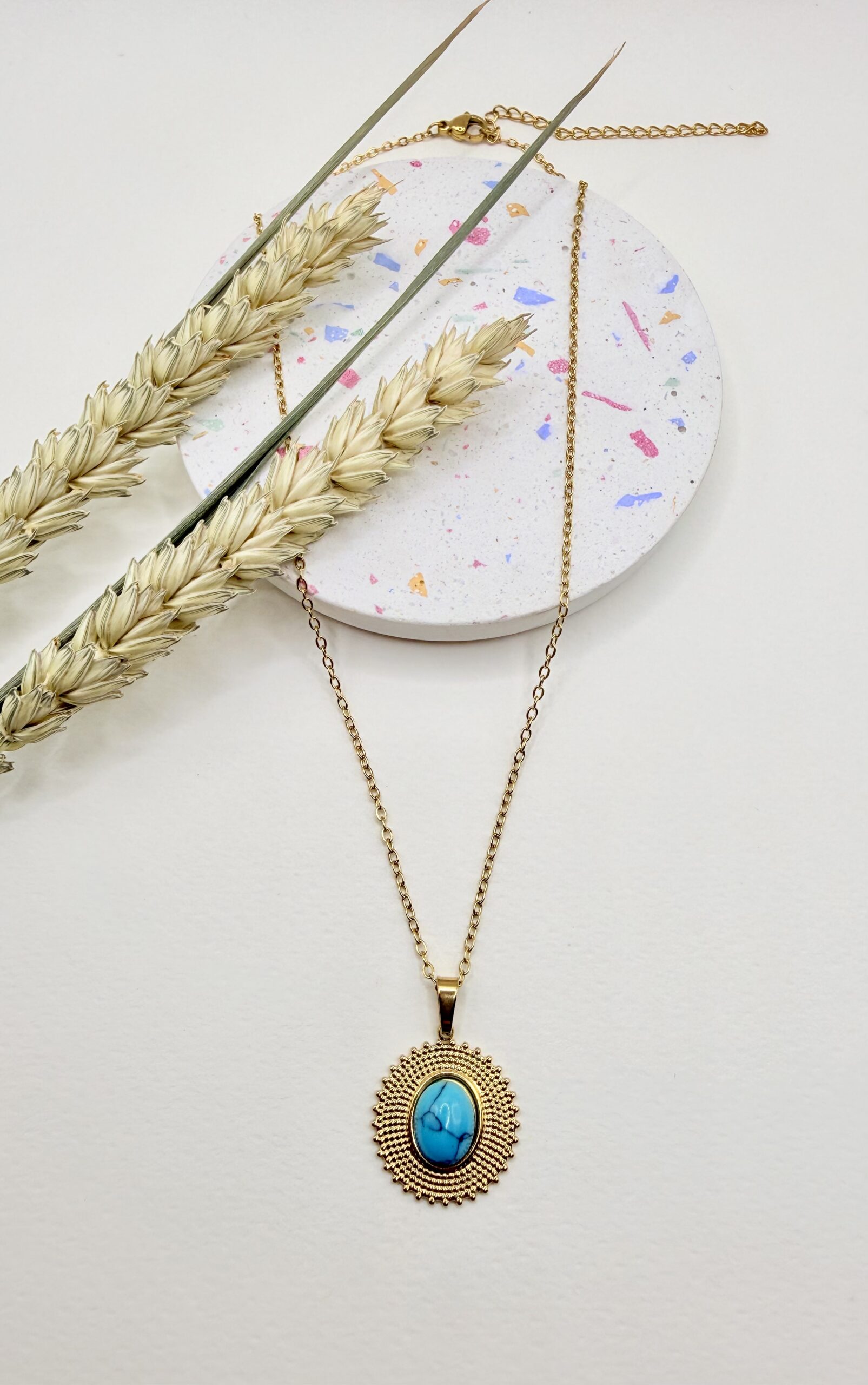 Λεπτομέρεια: Κεντρική τυρκουάζ-indigo πέτρα σε οβάλ κοπή, πλαισιωμένη από χρυσό ανάγλυφο περίγραμμα.