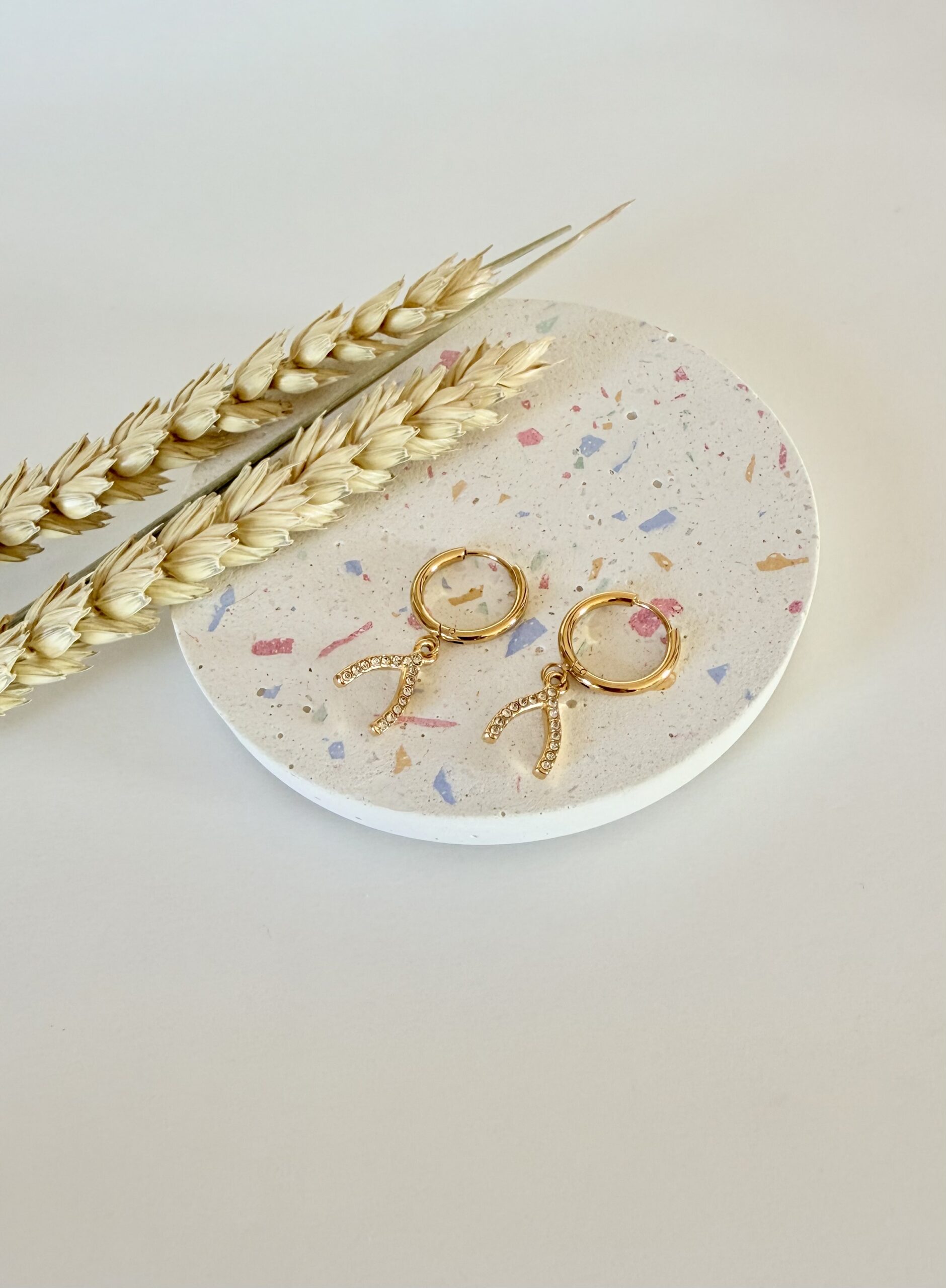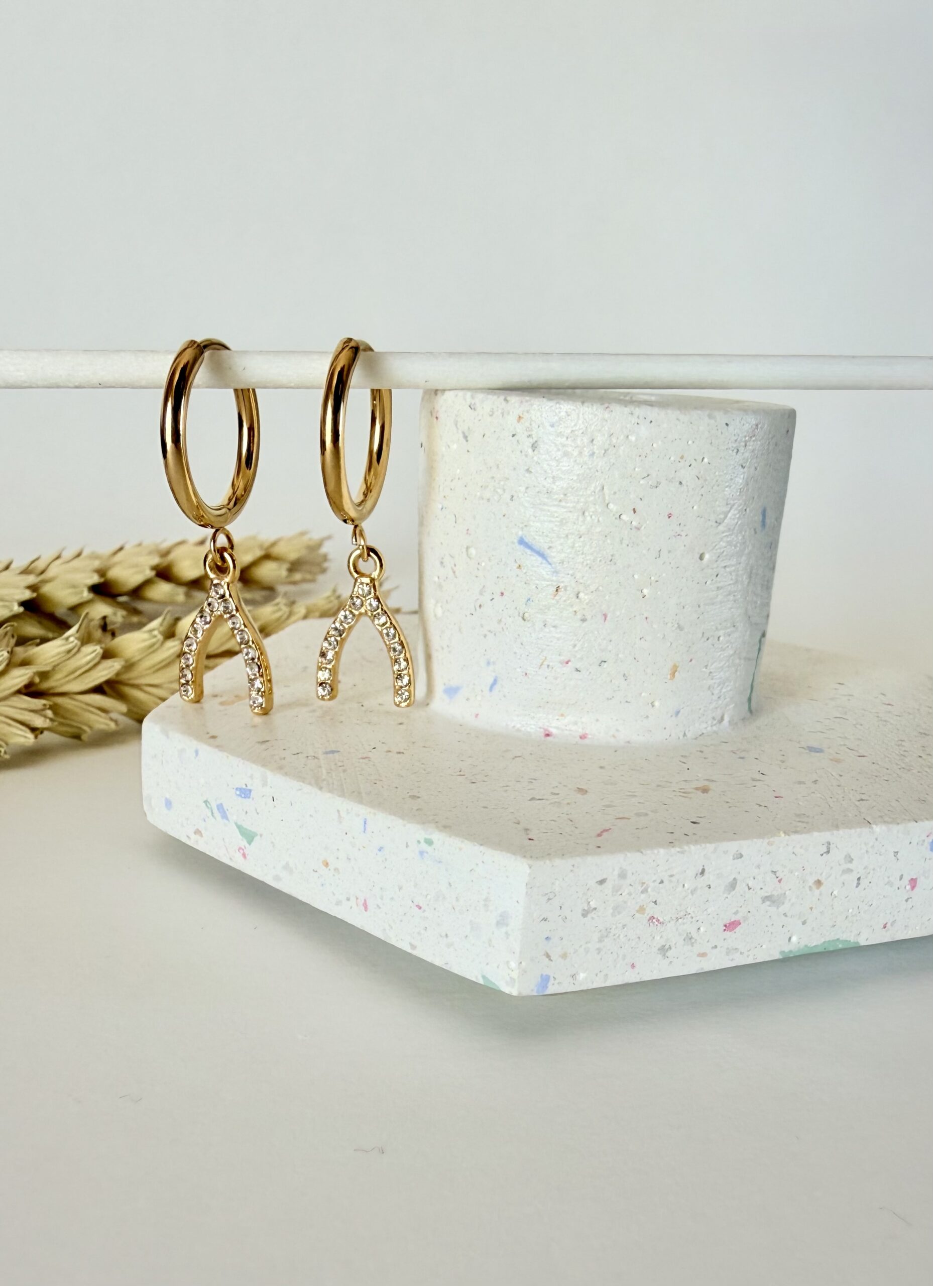 Το Sparkle Wish είναι το κόσμημα που θα σας συνοδεύει σε κάθε νέα αρχή! Κομψοί χρυσοί κρίκοι-huggies που κρατούν ένα συγκλονιστικό μενταγιόν σε σχήμα ‘wishbone’, στολισμένο με μικροσκοπικά, λαμπερά κρύσταλλα. Ένα σχέδιο που συνδυάζει τον συμβολισμό της καλής τύχης με τη διαχρονική πολυτέλεια του χρυσού. Είναι η λεπτομέρεια που θα δώσει λάμψη και θετική ενέργεια σε κάθε σας εμφάνιση.